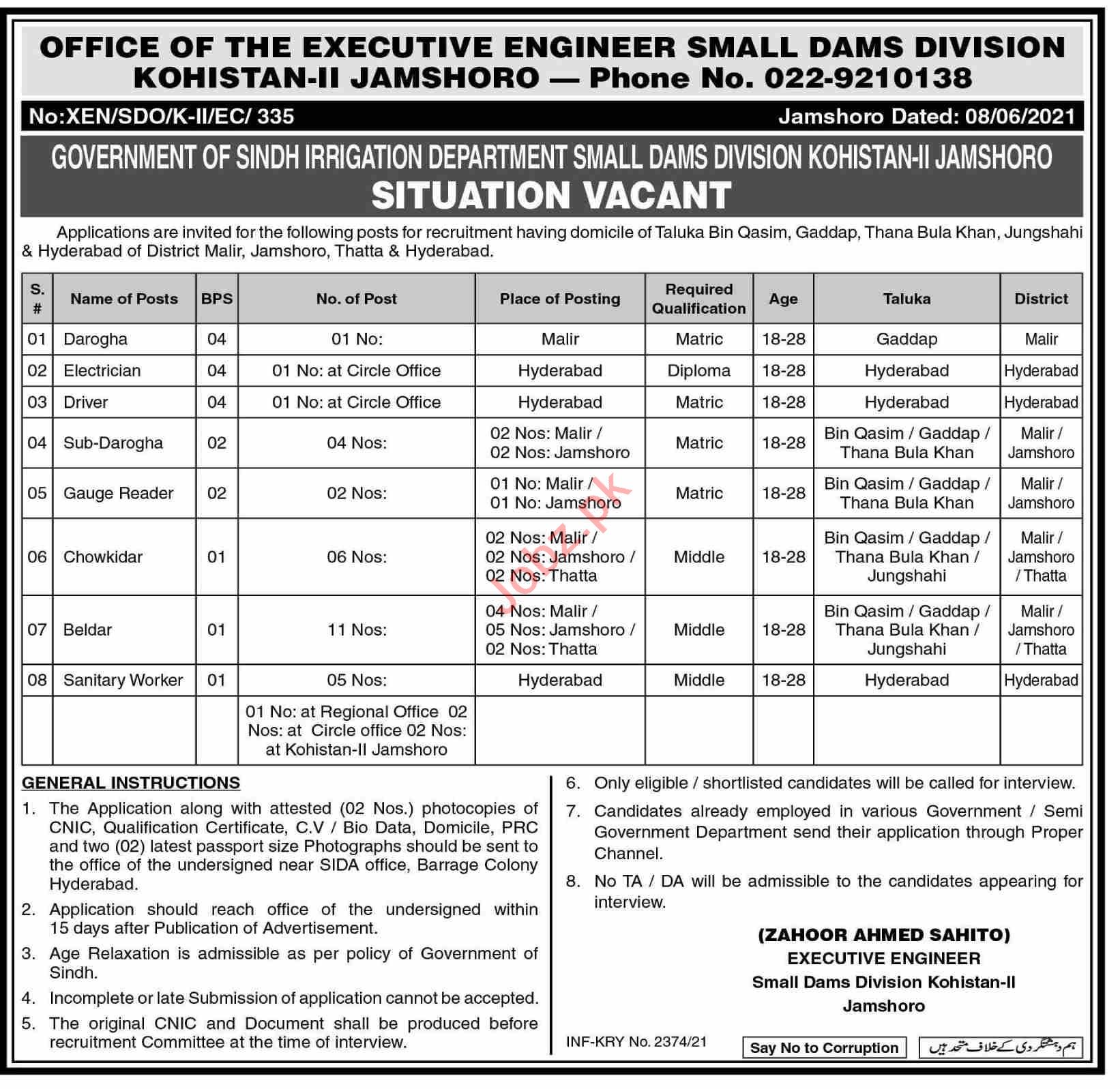 Small Dams Division Kohistan 2 Dadu Jobs 2021 For Beldar