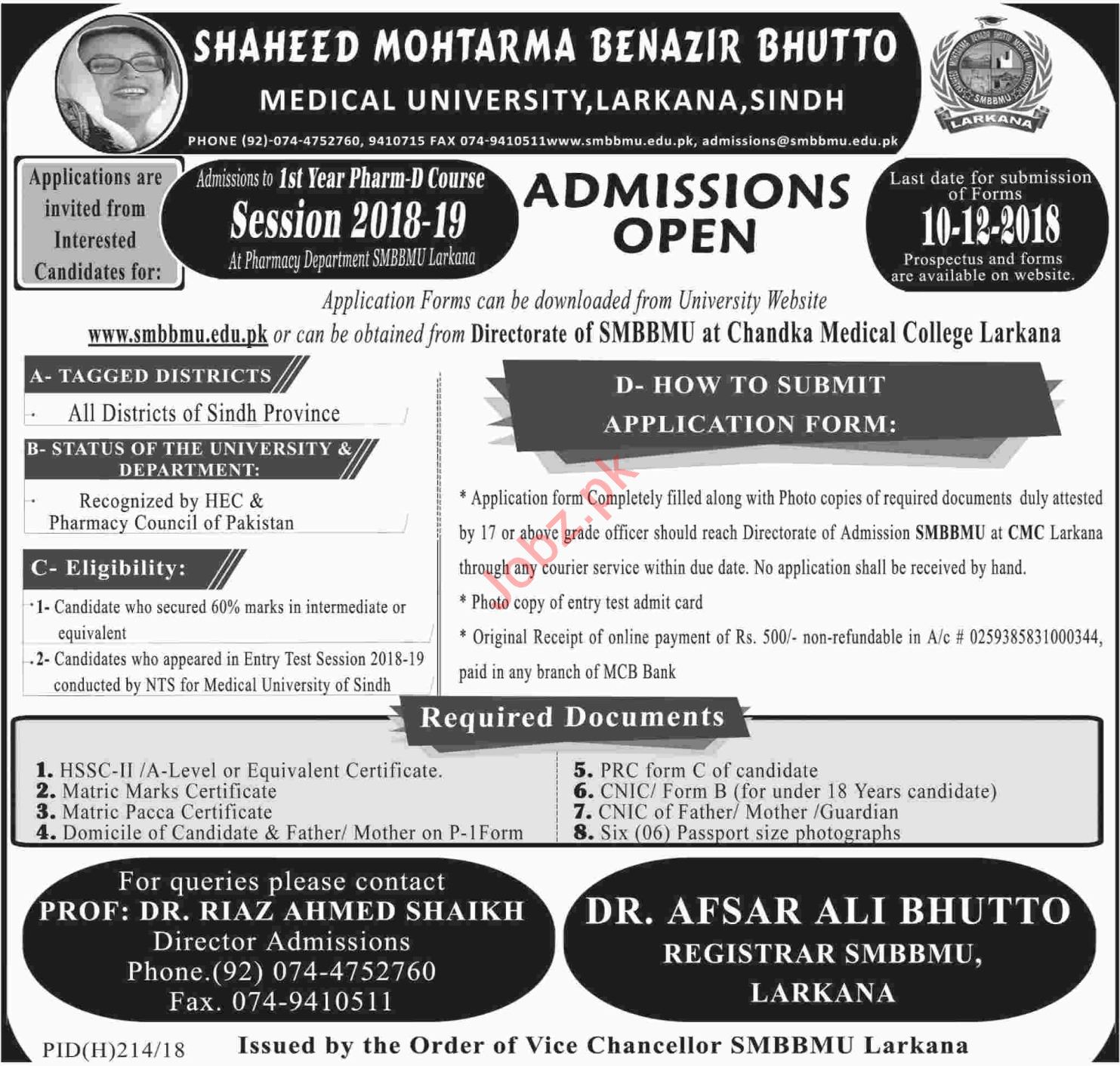 Shaheed Mohtarma Benazir Bhutto Medical University SMBBMU Larkana, Pakistan are opened admissions 2018-2019 for the classes of Pharm D Doctor of Pharmacy. Read newspaper ad for exact details.