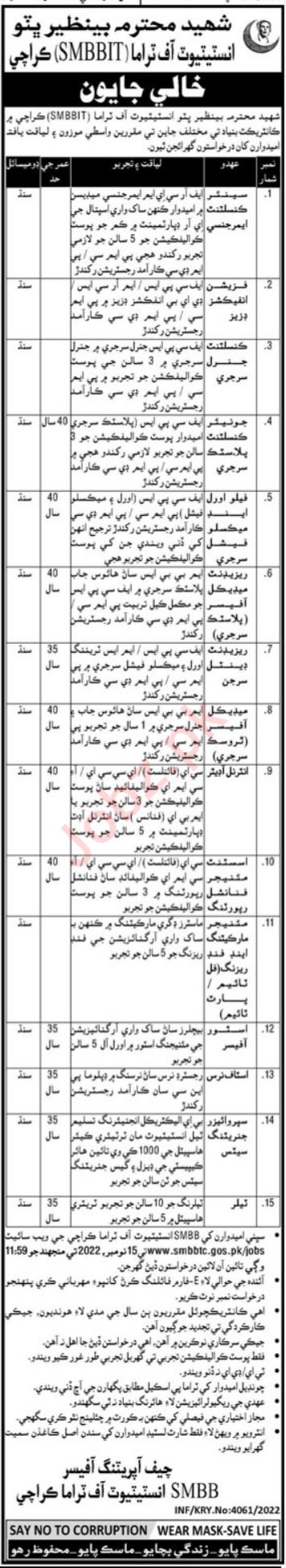 Vacancies in Shaheed Mohtarma Benazir Institute of Trauma SMBBIT Advertisement October 2022