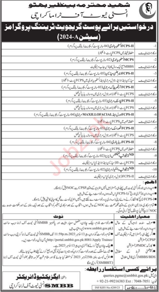 Shaheed Mohtarma Benazir Bhutto Institute of Trauma SMBBIT invites applications for job positions advertised in daily Jang dated 29 October 2023 for following vacancies in Karachi, karachi Sindh Pakistan.
