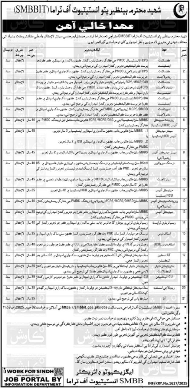 Apply at Shaheed Mohtarma Benazir Bhutto Institute of Trauma SMBBIT latest Government jobs in Medical and departments before closing date which is around June 3, 2025 or as per closing date in newspaper ad. Read complete ad online to know how to apply on latest Shaheed Mohtarma Benazir Bhutto Institute of Trauma SMBBIT job opportunities.