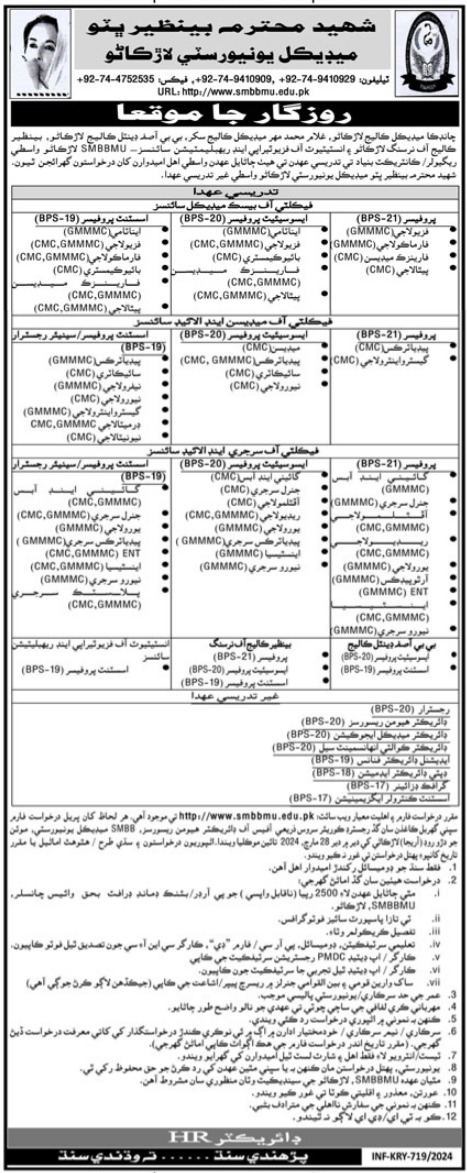 Shaheed Mohtarma Benazir Bhutto Medical University invites applications for job positions advertised in daily Kawish dated 15 March 2024 for following vacancies in Larkana, larkana Sindh Pakistan.
