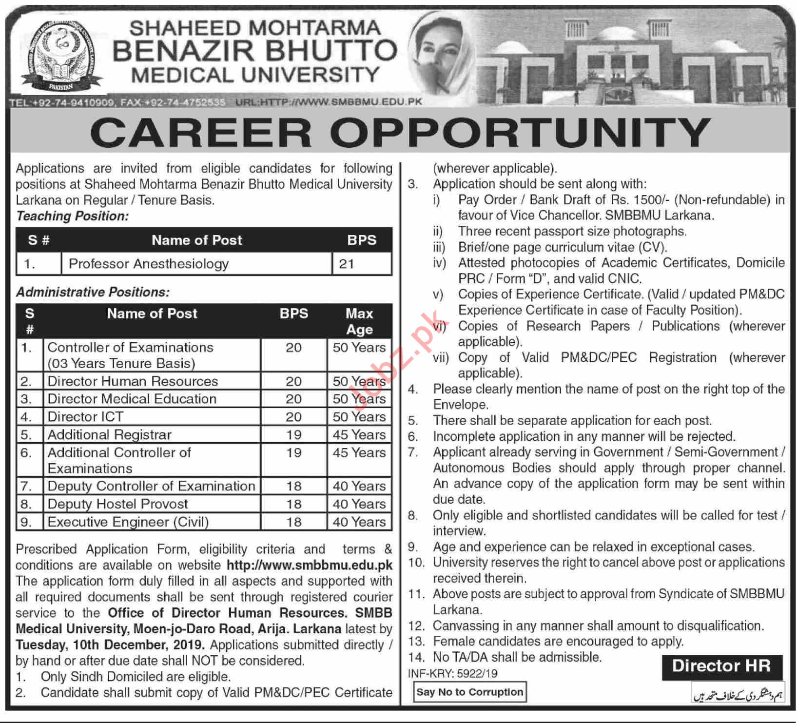SMBBMU Shaheed Mohtarma Benazir Bhutto Medical University Larkana, Government of the Sindh seeks candidates for the posts of Controller of Examination, Director, Director Human Resource, Director Medical Education, Director ICT, Additional Registrar, Additional Controller of Examination, Deputy Controller of Examination, Deputy Hostel Provost, Engineer, Civil Engineer, Executive Engineer, Professor, Professor Anesthesiology.