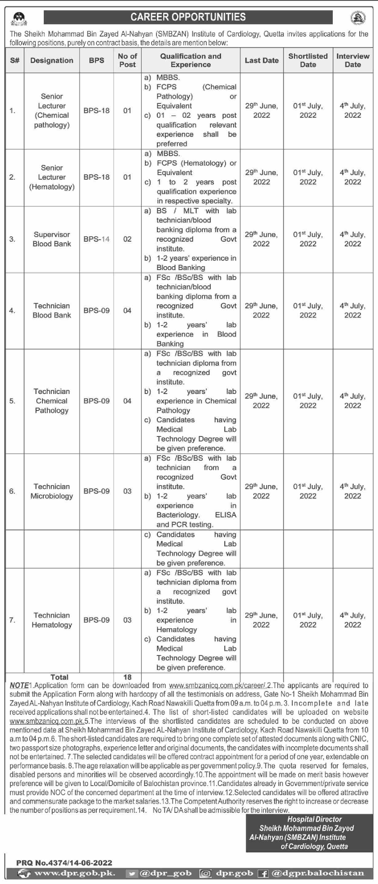 Sheikh Mohammad Bin Zayed Al Nahyan SMBZAN Institute of Cardiology jobs advertisement dated about 15 June 2022 in daily Dawn Newspaper invites application for the vacant post of technician microbiology, technician chemical pathology, supervisor blood bank, lecturer, technician blood bank, lecturer chemical pathology, lecturer hematology, technician hematology and supervisor in Quetta, quetta Balochistan Pakistan. Candidates with DAE, FCPS, FSc, BSc, MBBS, Bachelor, Others and Intermediate etc. educational background will be preferred.