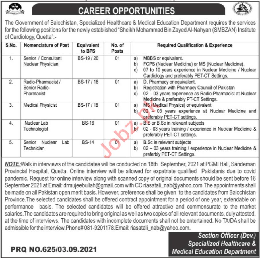 Sheikh Mohammad Bin Zayed Al Nahyan SMBZAN Institute of Cardiology Quetta, Specialized Healthcare & Medical Education Department, Government of the Balochistan is looking for the services from experienced candidates for the posts of Medical Consultant, Medical Specialist, Consultant Nuclear Physician, Radio Pharmacist, Senior Radio Pharmacist, Medical Physicist, Nuclear Lab Technologist, Senior Nuclear Lab Technician, Nuclear Lab Technician.