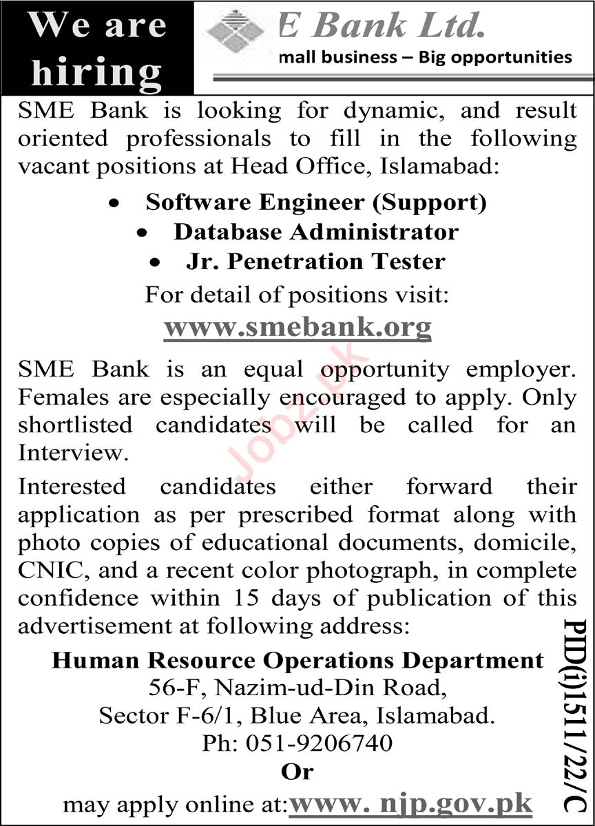 Vacant posts including software engineer, software support engineer, penetration tester and database administrator are announced in SME Bank Limited Islamabad, islamabad Islamabad Pakistan as per 11 September 2022 advertisement in daily Nawaiwaqt Newspaper. Preferred Education is Bachelor and Master etc.