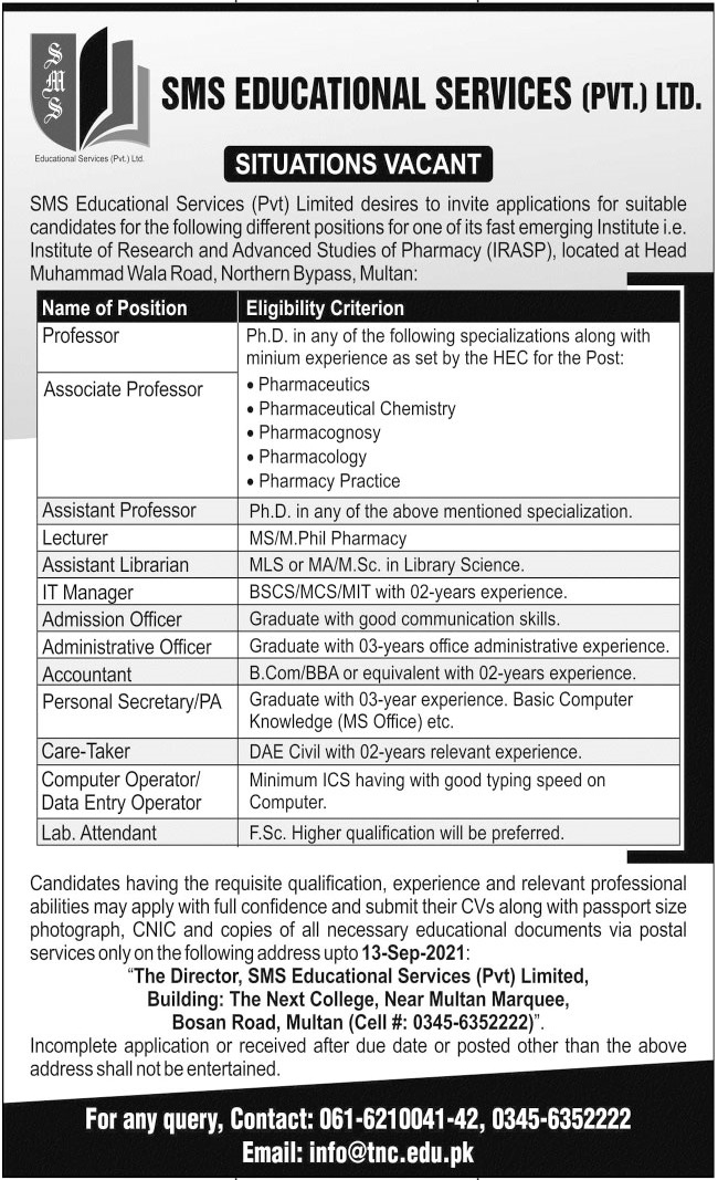 SMS Educational Services Pvt Limited invites applications form qualified and experienced individuals for the posts of Professor, Associate Professor, Assistant Professor, Lecturer, Assistant Librarian, IT Manager, Admission Officer, Administrative Officer, Accountant, Personal Secretary, Care Taker, Computer Operator, Data Entry Operator DEO and Lab Attendant in Multan.