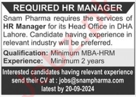 Vacant posts including hr manager are announced in Snam Pharmaceutical Lahore, lahore Punjab Pakistan as per 1 September 2024 advertisement in daily Jang Newspaper. Candidates with MBA etc. educational background will be preferred.