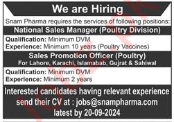 Snam Pharmaceutical Lahore, lahore Punjab Pakistan invites applications from eligible candidates for the post of sales promotion officer and national sale manager as per advertisement of September 1, 2024 published in daily Jang Newspaper. MS, Master and Bachelor etc. educational qualification will be preferred.