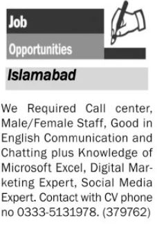 Call Center jobs advertisement dated about 10 January 2024 in daily The News Newspaper invites application for the vacant post of call center staff, digital marketing expert and social media expert in Islamabad, islamabad Islamabad Pakistan. Candidates with Bachelor, BA, DAE and Intermediate etc. educational background will be preferred.
