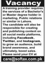 Private Company invites applications for job positions advertised in daily Jang dated 17 April 2022 for following vacancies in Lahore, lahore Punjab Pakistan.