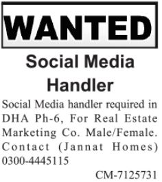 Real Estate Company jobs advertisement dated about 18 November 2022 in daily Jang Newspaper invites application for the vacant post of social media handler in Lahore, lahore Punjab Pakistan. Preferred Education is Intermediate and Bachelor etc.