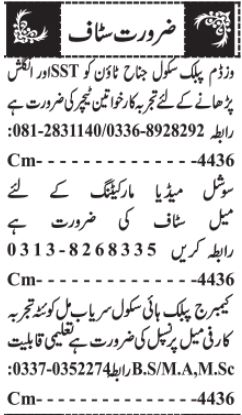 Private Company jobs advertisement dated about 27 March 2024 in daily Jang Newspaper invites application for the vacant post of social media marketing expert, teacher, female principal, social studies teacher, lady teacher, principal and english teacher in Quetta, quetta Balochistan Pakistan. Candidates with MA, BA, Bachelor, M.sc and Master etc. educational background will be preferred.
