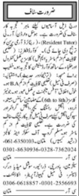 Private Company jobs advertisement dated about 17 February 2024 in daily Khabrain Newspaper invites application for the vacant post of khateeb, teacher, mathematics teacher, accountant, receptionist, english teacher, computer operator, english grammer teacher, urdu teacher, salesman, social media worker, science teacher, dispenser, hostel warden, driver, coordinator, drawing teacher and cook in Multan, multan Punjab Pakistan. Preferred Education is Master, Intermediate, B.ed, M.sc, BA, Mphil, Bachelor and Matric etc.