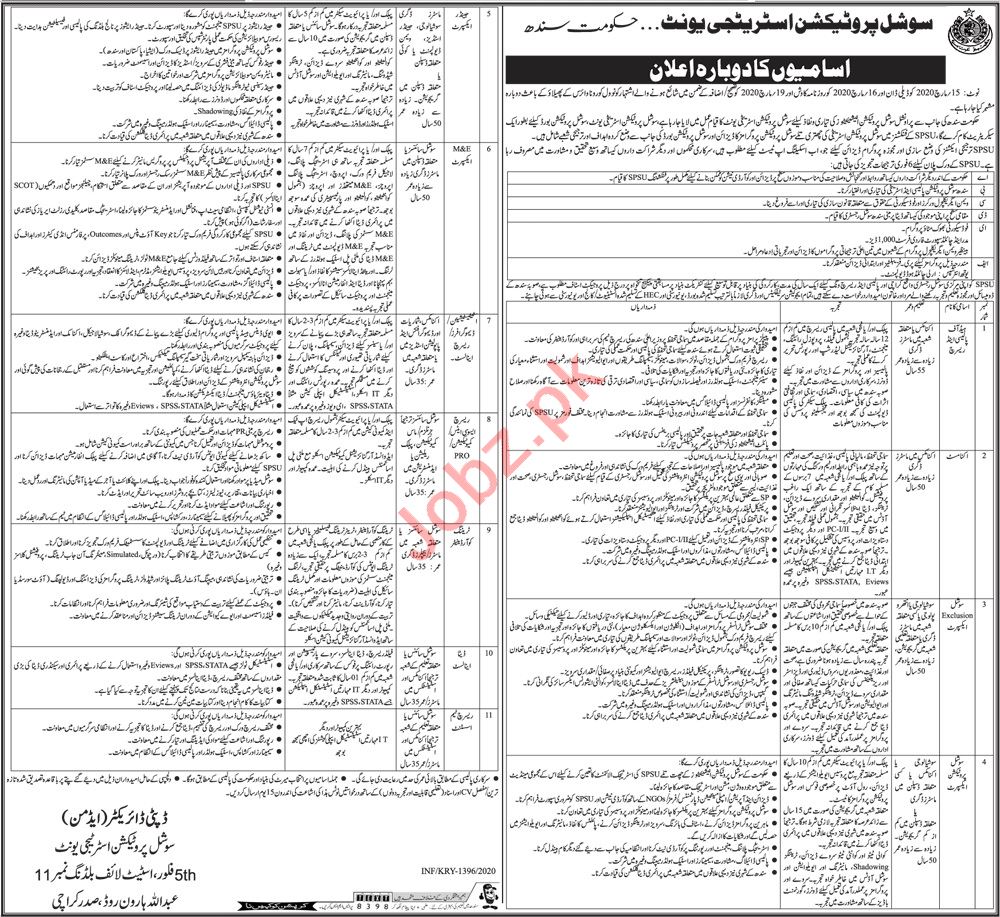 Social Protection Strategy Unit SPSU Karachi, Government of the Sindh require candidates for the posts of Head of Policy, Head of Research, Economist, Social Exclusion Expert, Social Protection Expert, Gender Expert, M&E Expert, Statistician, Demographer, Research Analyst, Research Associate, Research Team Assistant.