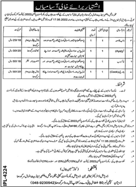 Social Welfare & Bait ul Maal jobs advertisement dated about 21 April 2022 in daily Jang Newspaper invites application for the vacant post of bawarchi, khakrob, aya and naib qasid in Sargodha, sargodha Punjab Pakistan. Primary and Middle etc. educational qualification will be preferred.