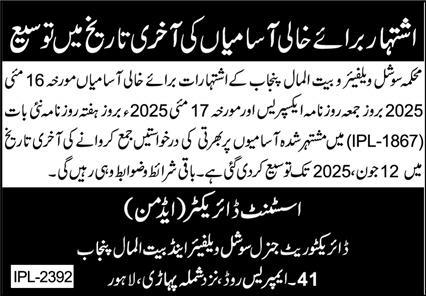 Social Welfare & Bait ul Maal latest Government Human Resource jobs and others can be applied till June 12, 2025 or as per closing date in newspaper ad. Read complete ad online to know how to apply on latest Social Welfare & Bait ul Maal job opportunities.