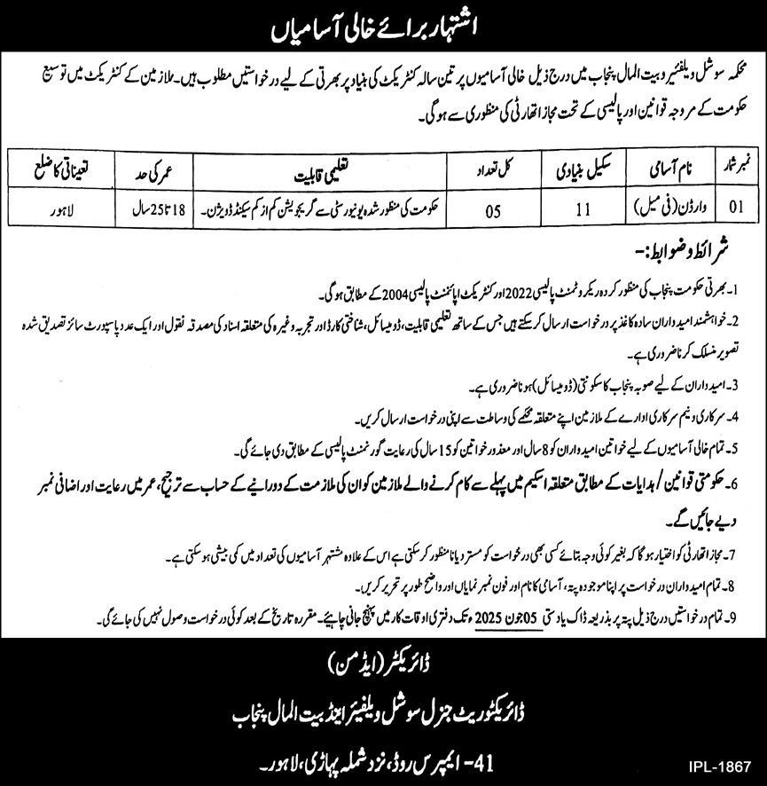 Social Welfare & Bait Ul Maal Punjab Jobs 2025 For Warden
