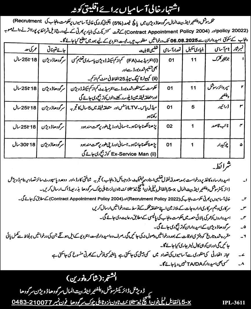 Social Welfare & Bait Ul Maal Sargodha Division Jobs 2025