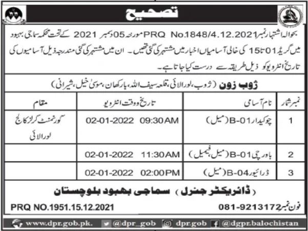 With the reference of advertisement number PRQ No.1848/4.12.2021 published on 05 December 2021 for the post of Chowkidar, Cook, Driver in Zhob Zone is scheduled interviews according to this corrigendum. Interviews would be held on 2nd January 2022 at 9:30 AM to 2:00 PM in Government Girls College Loralai.
