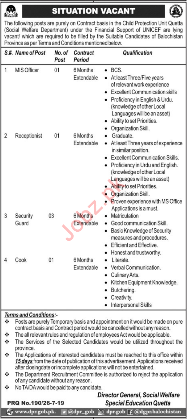 Social Welfare Department Quetta Jobs 2019