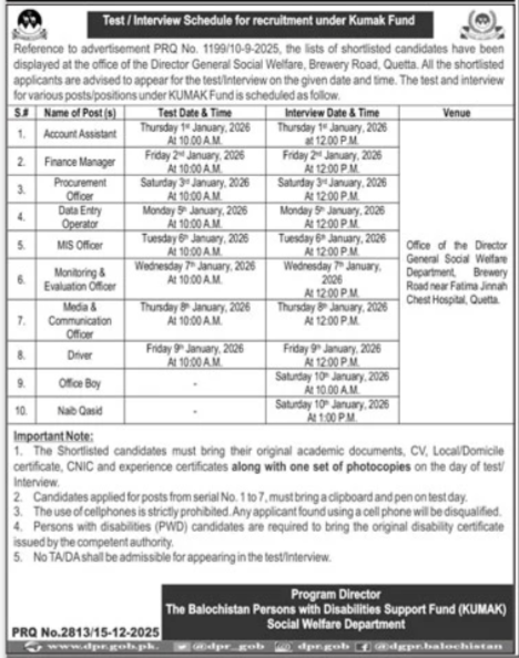Social Welfare Department is looking for candidates for following posts as per job advertisement published in daily Jang Newspaper of December 16, 2025 for location Quetta, quetta Balochistan Pakistan: