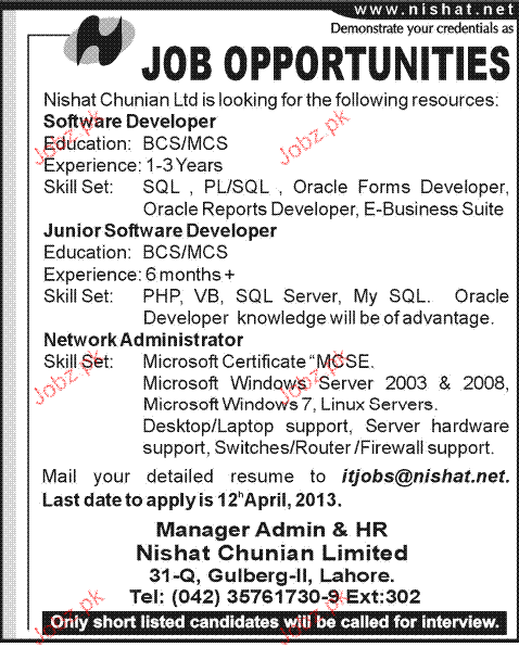 Apply as per details in job advertisement. Login to view further details of how to apply via https://www.jobz.pk online.