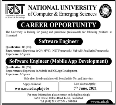 Vacancies in National University of Computer and Emerging Sciences Advertisement May 2021