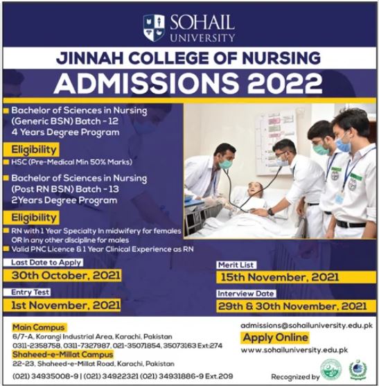 Sohail University invites applications for admissions in Bachelor of Sciences in Nursing Generic BSN Batch - 12 4 Years Degree Programs in Jinnah College of Nursing Karachi. Read newspaper ad for exact details.
