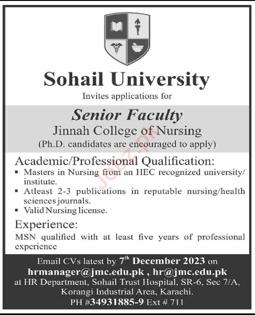 Sohail University is looking for candidates for following posts as per job advertisement published in daily Dawn Newspaper of November 12, 2023 for location Karachi, karachi Sindh Pakistan: