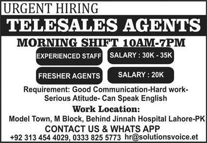 Solutions Lahore, lahore Punjab Pakistan invites applications from eligible candidates for the post of telesales agent as per advertisement of February 27, 2022 published in daily Express Newspaper. Educational qualifications required Bachelor and Intermediate etc.