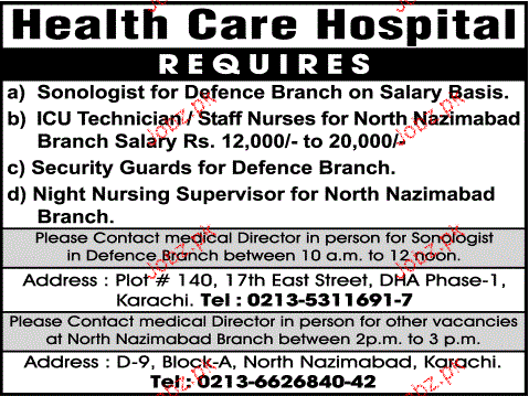 Sonologist, ICU Technicians and Nursing Supervisors Wanted