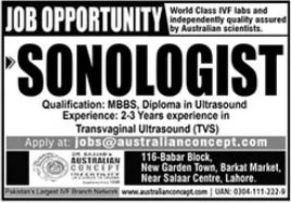 Australian Concept Infertility Medical Center Lahore, lahore Punjab Pakistan invites applications from eligible candidates for the post of sonologist as per advertisement of October 20, 2024 published in daily Jang Newspaper. MBBS etc. educational qualification will be preferred.