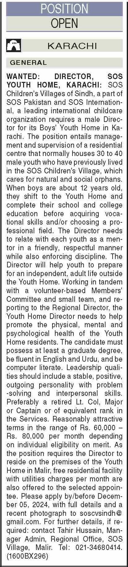 SOS Children Village of Pakistan is looking for candidates for following posts as per job advertisement published in daily Dawn Newspaper of November 27, 2024 for location Karachi, karachi Sindh Pakistan: