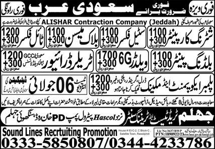 Sound Lines Recruiting Promotion latest Overseas Industrial jobs and others can be applied till July 6, 2023 or as per closing date in newspaper ad. Read complete ad online to know how to apply on latest Sound Lines Recruiting Promotion job opportunities. On job accommodation, transport and medical facility is provided.