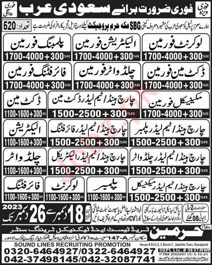 Sound Lines Recruiting Promotion Riyadh, riyadh Saudi Arabia invites applications from eligible candidates for the post of Child Water Technician, Fire Fighting Foreman, Team Leader Mechanical, Team Leader Electrical, Plumber, Plumbing Foreman, Electrical Foreman, Low Current Electrician, Child Water Foreman, Team Leader Child Water, Team Leader Fire Fighting, Electrician, Team Leader Docketman, Low Current Foreman, Team Leader Plumber, Docketman, Fire Fighting Technician, Mechanical Foreman and Docketman Foreman as per advertisement of December 10, 2023 published in daily Express Newspaper. Candidates with Matric, Intermediate and Middle etc. educational background will be preferred.