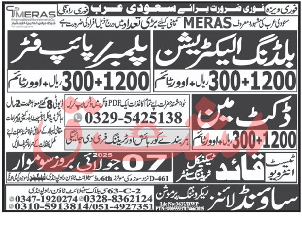 Vacant posts including duct man, building electrician, plumber and pipe fitter are announced in Sound Lines Recruiting Promotion Riyadh, riyadh Saudi Arabia as per 4 July 2025 advertisement in daily Mashriq Newspaper. Educational qualifications required Primary, Middle and Matric etc.