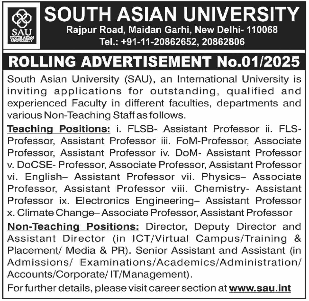 Latest Education jobs and others Private jobs in South Asian University SAU closing date is around March 1, 2025, see exact from ad. Read complete ad online to know how to apply on latest South Asian University SAU job opportunities.
