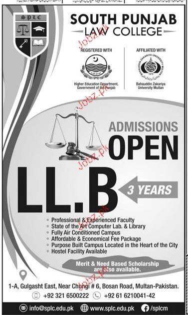 South Punjab Law College Admission in LLB Three Year Programs in Multan. Merit and Need Based Scholarship are also available. Affordable and Economical Fee Package. Read newspaper ad for exact details.