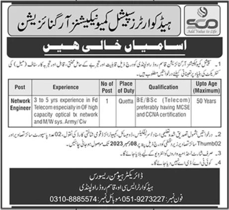 Special Communication Organization SCO subordinate of Pakistan Army is looking for candidates for following posts as per job advertisement published in daily Jang Newspaper of November 25, 2023 for location Quetta, quetta Balochistan Pakistan: