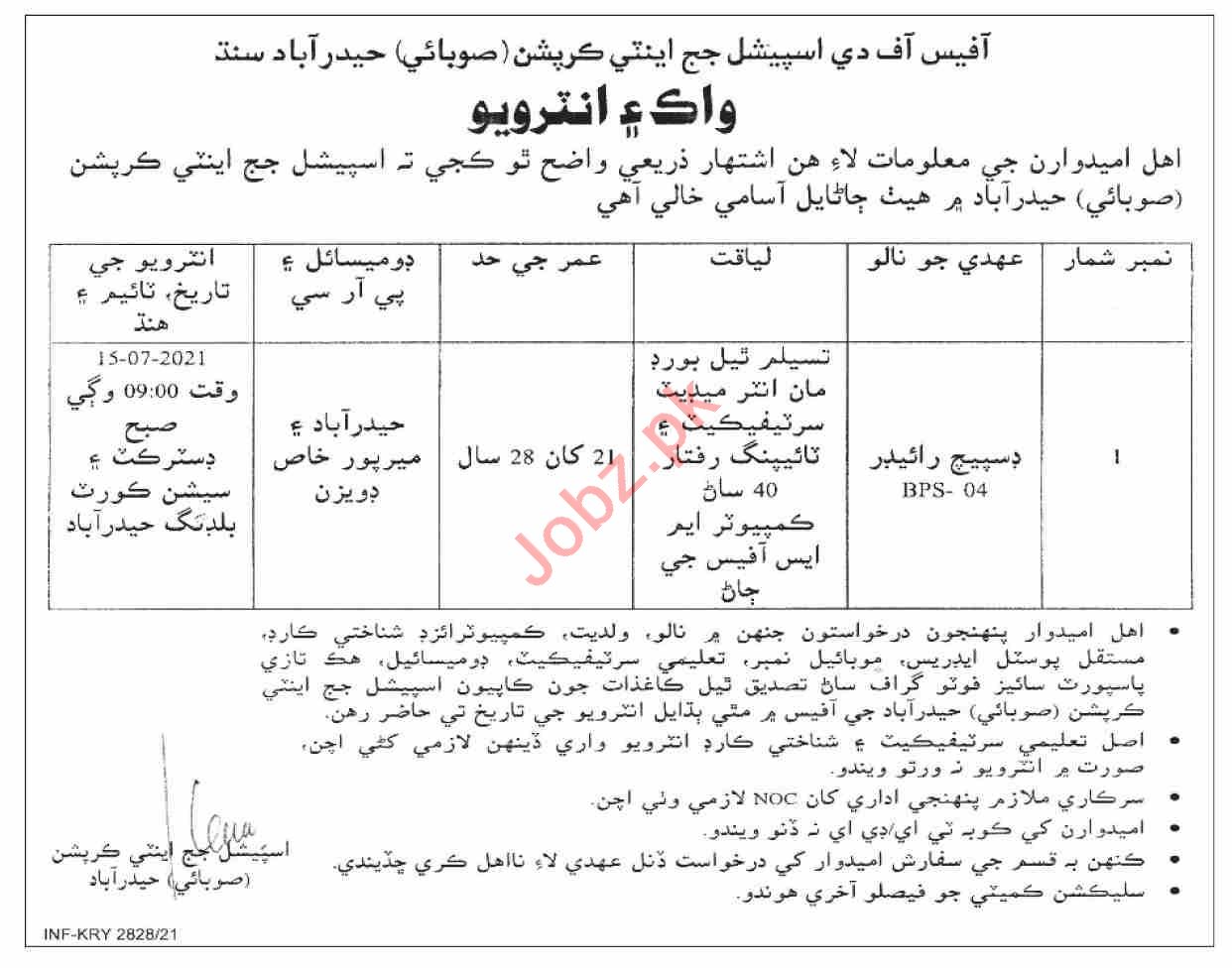 Special Court Anti Corruption Provincial Hyderabad Jobs 2021
