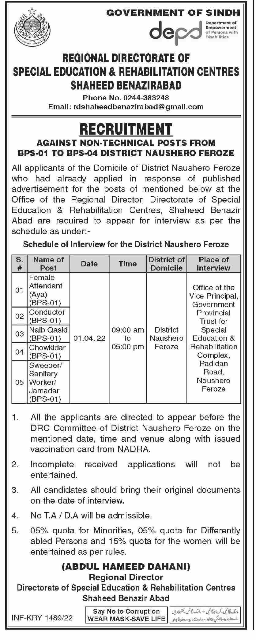 Directorate of Special Education jobs advertisement dated about 24 March 2022 in daily Dawn Newspaper invites application for the vacant post of jamadar, aya, sweeper, chowkidar, sanitary worker, female attendant, naib qasid and conductor in Naushahro Feroze, benazirabad and naushahro feroze Sindh Pakistan. Candidates with Matric, Middle and Primary etc. educational background will be preferred.