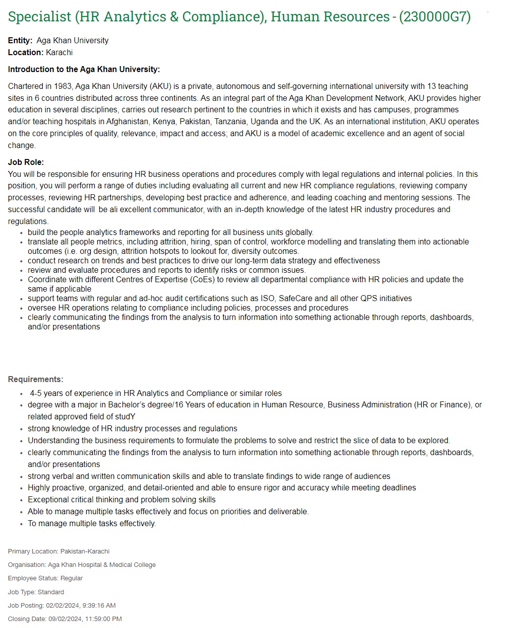 Vacant posts including specialist, specialist human resource, specialist hr analytics and specialist compliance are announced in Aga Khan University Karachi, karachi Sindh Pakistan as per 3 February 2024 advertisement in daily Other Newspaper. Candidates with Master and Bachelor etc. educational background will be preferred.