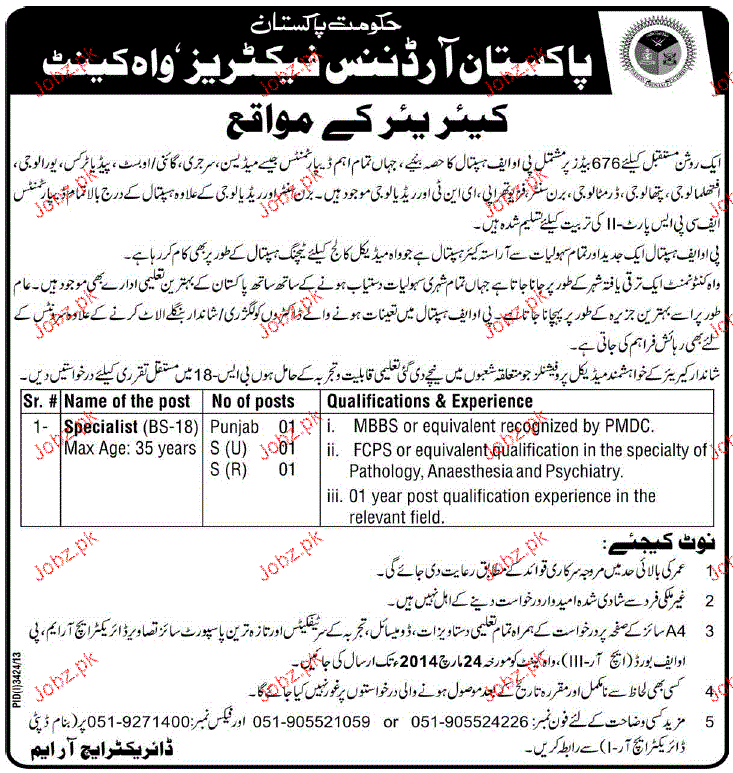 Specialists Job In Pakistan Ordinance Factories Wah Cant