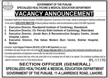Specialized Healthcare & Medical Education Department is looking for candidates for following posts as per job advertisement published in daily Jang Newspaper of December 27, 2023 for location Lahore, lahore Punjab Pakistan: