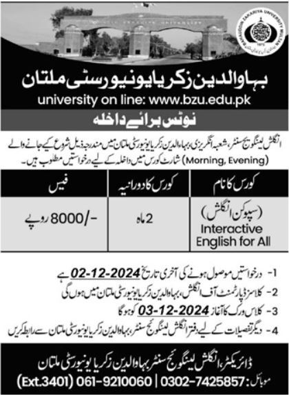 Bahauddin Zakariya University Multan BZU Spoken English Course admissions 2024 has been started. Students can enroll for admissions in Bahauddin Zakariya University Multan BZU Multan Punjab Pakistan for academic year 2024 to continue campus based or online education in Language University. Eligible students for fulfilling criteria for admissions in Course can enroll as per Government admission policy 2024 till closing date 2 December 2024. Read newspaper ad for exact details.