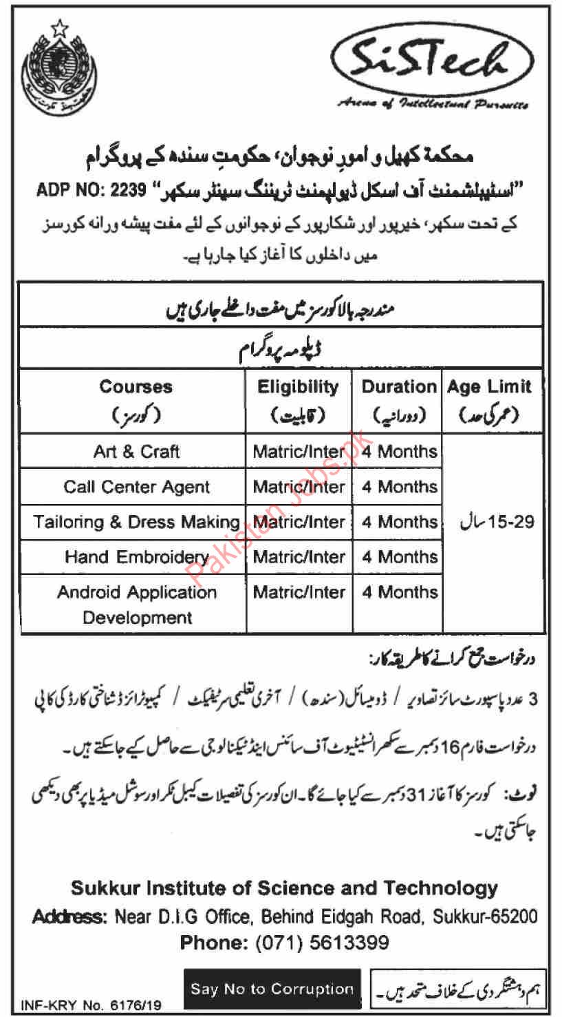 Sports & Youth Affairs Department , Government of Sindh announced free Professional Training Course in Art & Craft, Call center Agent, Tailoring & Dress Making, Hand Embroidery, Android Application Development in Shikarpur and Khairpur. Read newspaper ad for exact details.