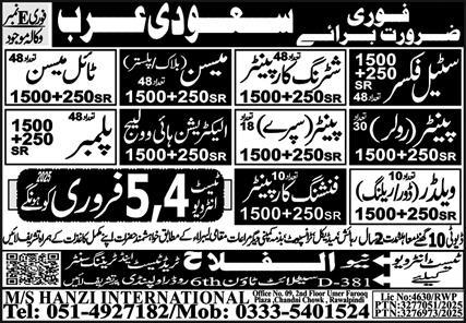 New Al Falah Trade Test & Training Center jobs advertisement dated about 29 January 2025 in daily Express Newspaper invites application for the vacant post of electrician high voltage, tile mason, welder, spray painter, steel fixer, painter, plaster mason, roller painter, shuttering carpenter, mason, plumber, finishing carpenter and block mason in Dammam, al khobar Saudi Arabia. Matric, DAE and Intermediate etc. educational qualification will be preferred.
