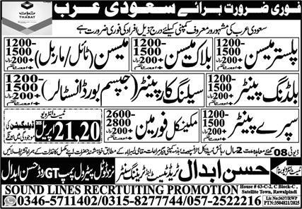 Hassan Abdal Trade Test & Training Center jobs advertisement dated about 19 April 2025 in daily Express Newspaper invites application for the vacant post of mechanical foreman, spray painter, plaster mason, mason, block mason, tile mason, marble mason, gypsum board installer, ceiling carpenter and building painter in Dammam, jeddah Saudi Arabia. Preferred Education is DAE, Bachelor, Intermediate and Matric etc.