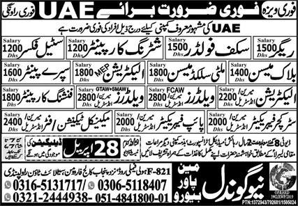 Vacant posts including industrial electrician, mechanical technician, electrician, block mason, structure fabricator, steel fixer, multi skilled mason, finishing carpenter, shuttering carpenter, mep electrician, pipe fabricator, rigger, industrial welder, fcaw welder, mason, scaffolder, spray painter and welder are announced in New Gondal Manpower Bureau Abu Dhabi, sharjah UAE as per 26 April 2023 advertisement in daily Express Newspaper. Candidates with DAE, Intermediate, Bachelor and Matric etc. educational background will be preferred.